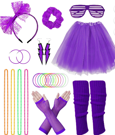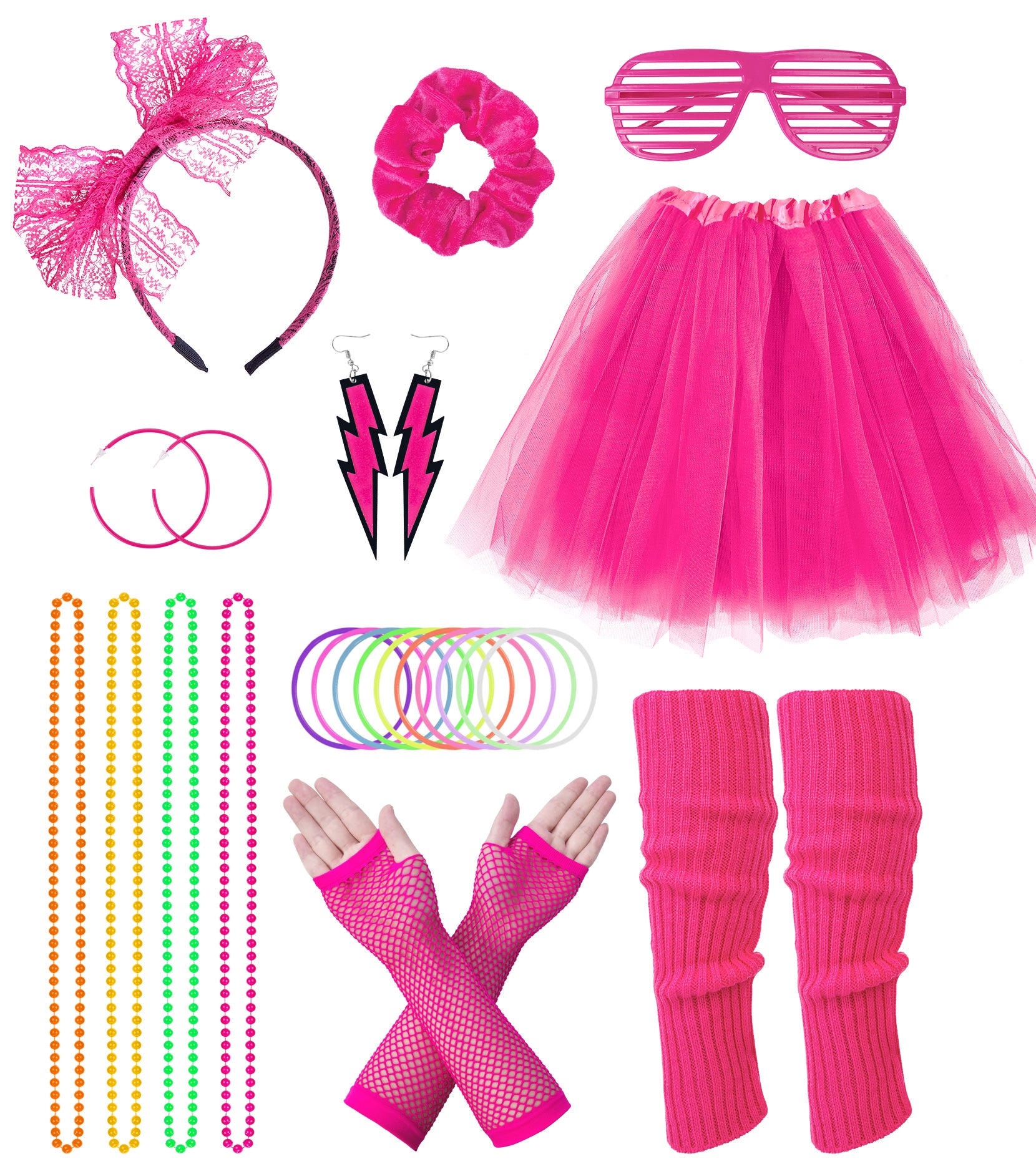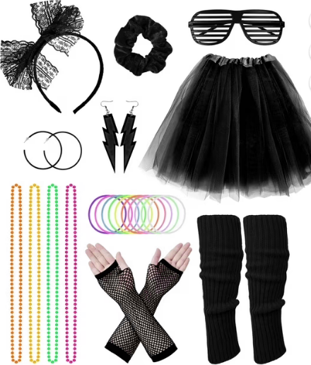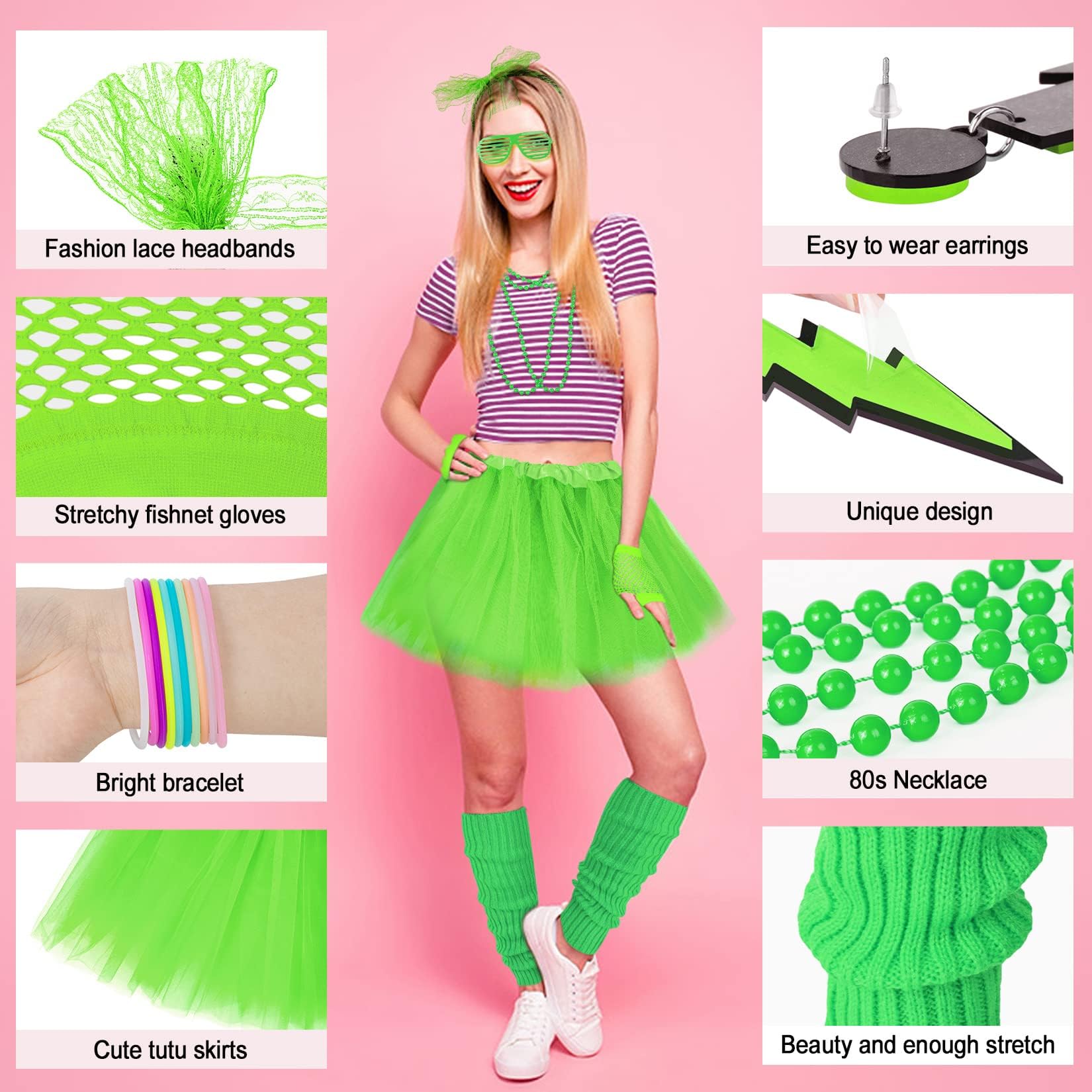 - Value Set: Women’s 80s party supply includes 1 pair of legs, a mesh skirt, 4 necklaces, 1 pair of long gloves, 1 pair of glasses, 1headband, 1 pair of lightning earrings, 1 pair of large hoop earrings, 1 large scrunchie, 10 bracelets. Great for 80's costume accessories and Halloween costume.
