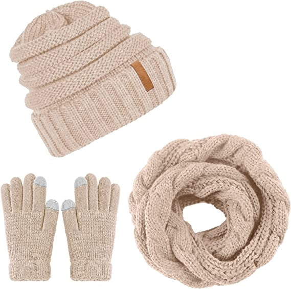 All-match accessories: Simple and classic knitting style, that match well with sweaters, cardigans, coats, and many different outfits, not only keeping you toasty but also making you nice and trendy. The color of touch screen gloves, scarf, and winter hat match very well, so you do not need to waste time purchasing them separatelyQuantity: 1 piece of knit beanie, 1 piece of knit scarf, 1 pair of touch screen gloves in one package, they match very well with each other; if there is any question about the product quality or other aspects that make you disappointed, please feel free to contact us in time, we will offer our best service