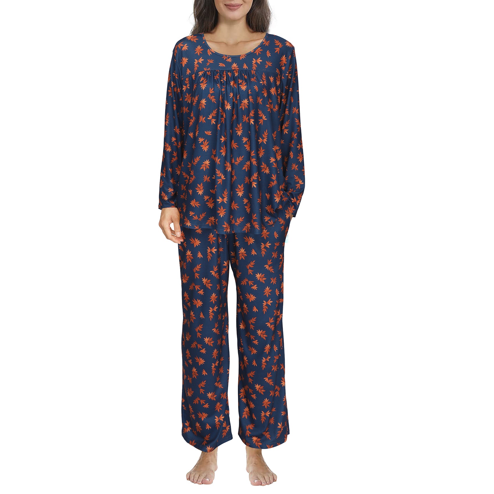 - Two-piece pajama set comes with casual round collar long sleeve pajama top, and matching pants with 2 side pockets. These loungewear features with front pleated detailed design, pajama pants have elastic waistband, with an excellent elasticity.