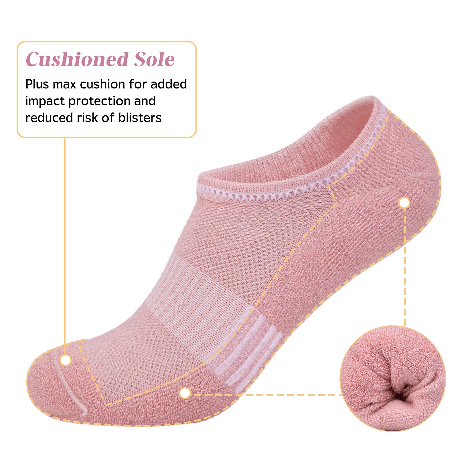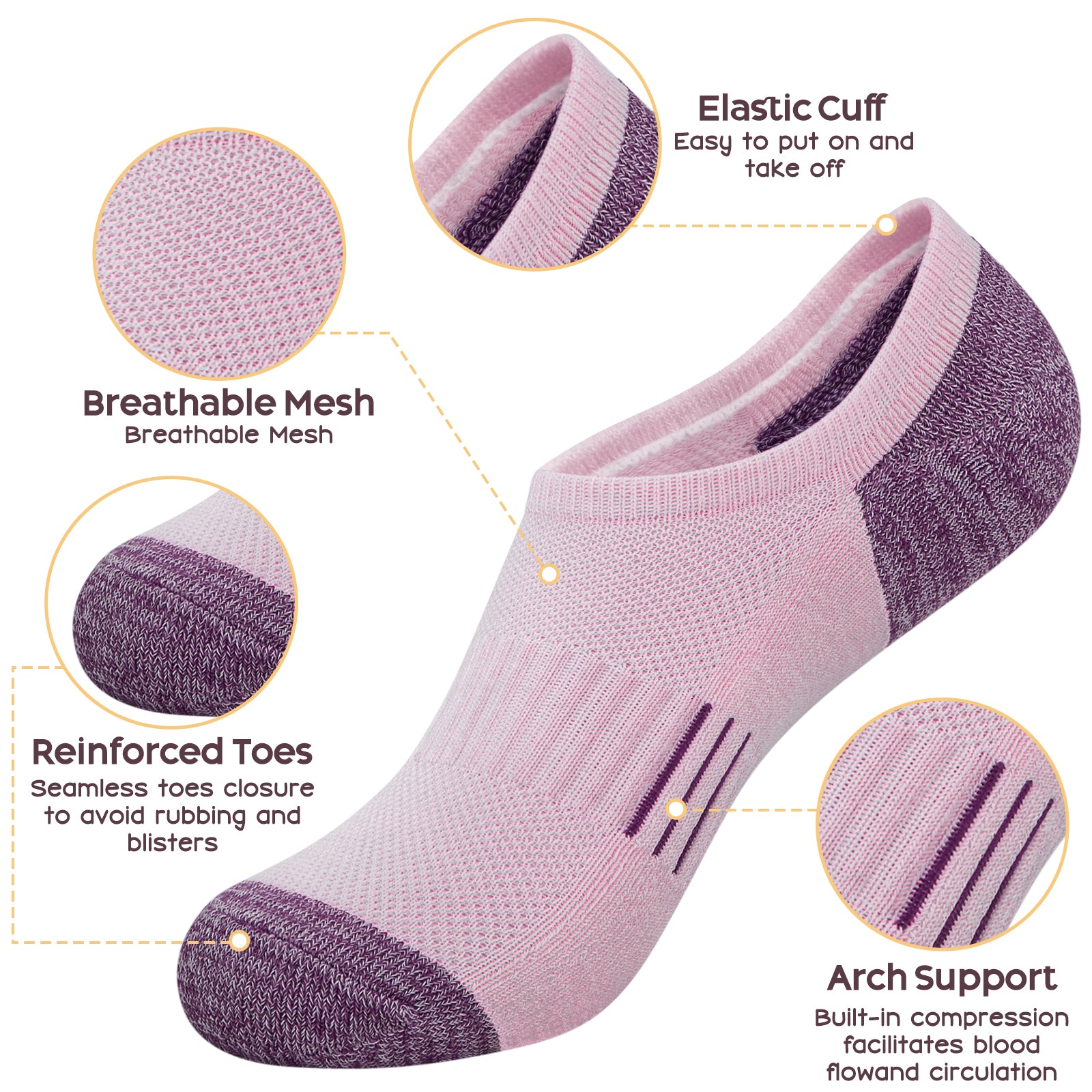 - Arch Support & Cushion Socks: Upgraded cushion sole covers the entire bottom of the no show socks. Provide maximum cushioning space for the foot, reducing friction in sports or daily activities. Proper compression of the arch will keep your arch safe and stable while reinforced heel and toe provide outstanding durability.